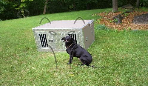A rescued Pitt Bull Mix posing in one of our custom collars beside one of our custom Sportsman Transport Boxes.
