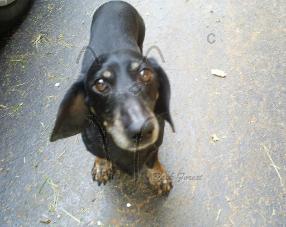 A rescued Miniature Dachshund. Don't let his small size fool you. He easily plays with the big boys.